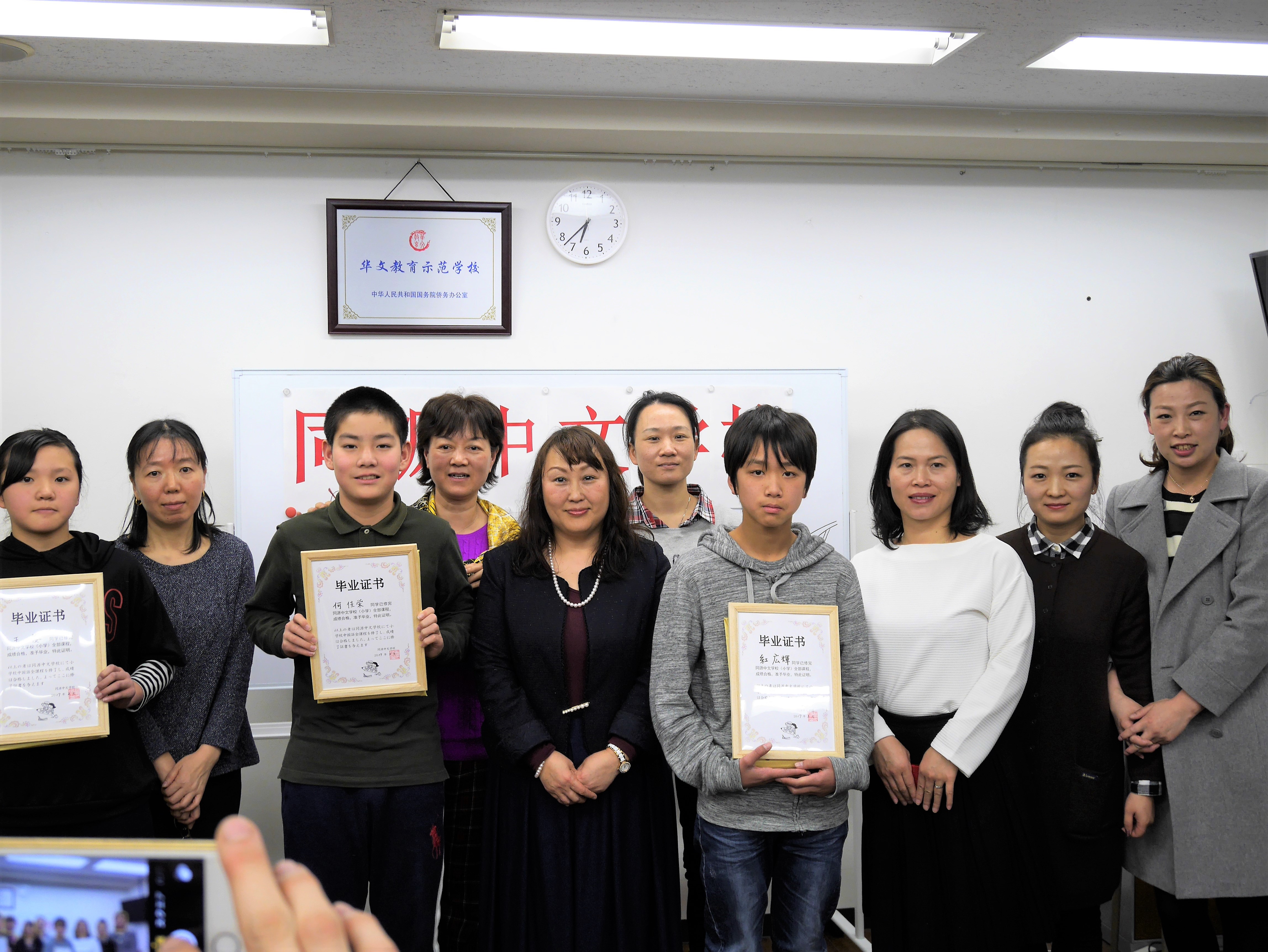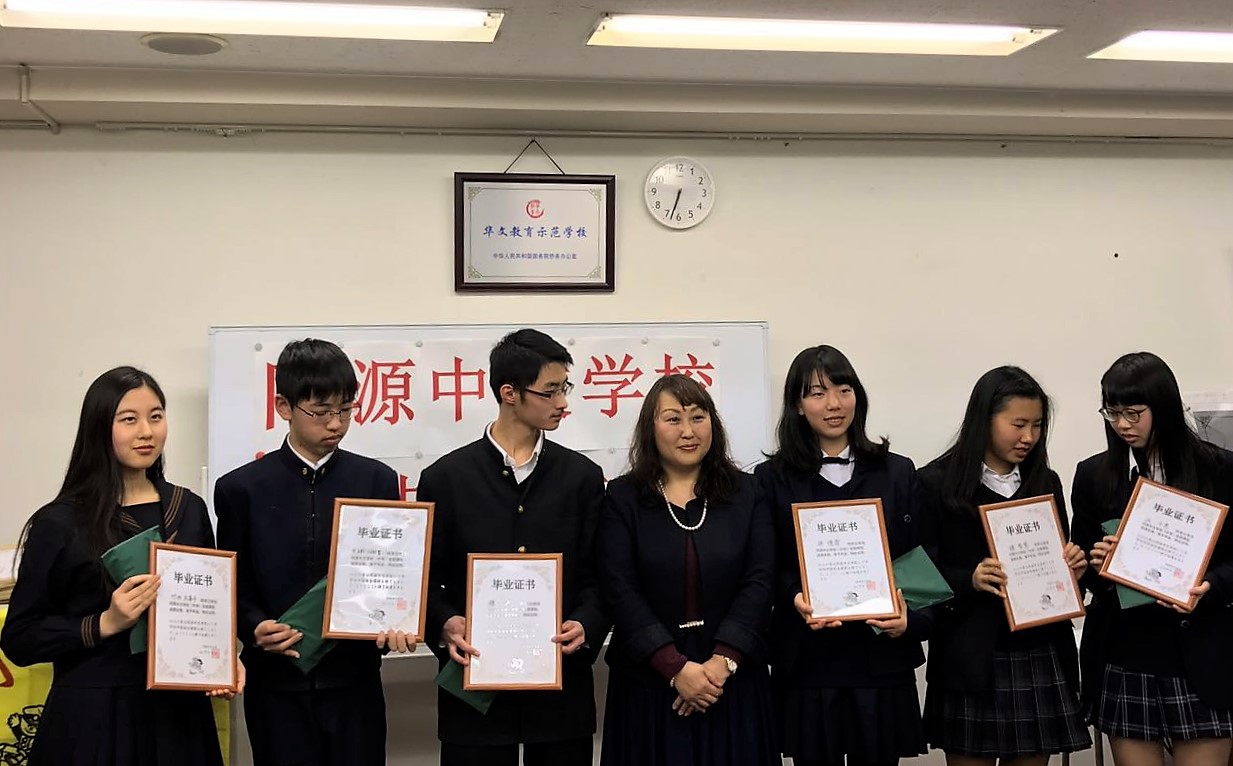 毕业典礼由吴梅老师主持。竹内万喜子和冷峻一同学分别作为初中班和小学班的毕业生代表发言,分享了他们坚持不懈学习中文、在“汉语桥”决赛以及同源中文朗诵比赛、作文比赛中获奖的经验,感慨中文给自己的生活带来新机遇,表示将在未来的生活中继续学习中文,在新的起点上继续奋力拼搏。两位毕业生代表的发言赢得了热烈的掌声。崔艳华老师作为教师代表发言,讲述了在教课期间与学生真挚动人的经历,表达了老师们对毕业生的热烈祝贺和殷切期盼。梁德华女士作为家长代表发言,分享了孩子在学习中文过程中的成长,感谢同源中文学校给予的帮助。随后杨林校长对学生们和同源中文学校的成长表达了深深的感概,对即将踏上新征程的毕业生提出了希望:孝父母,敬师长。她祝愿毕业生在今后的学习生活中取得更大的进步,成为连接中日友好关系的桥梁。最后各班主任老师为学生们颁发了毕业证书和礼物并合影留念。典礼一直在热烈的氛围中进行着。