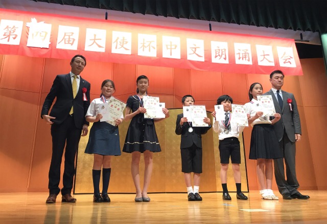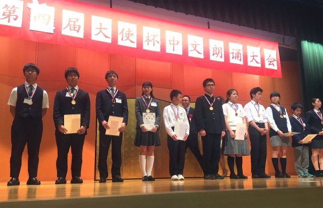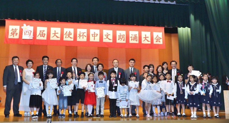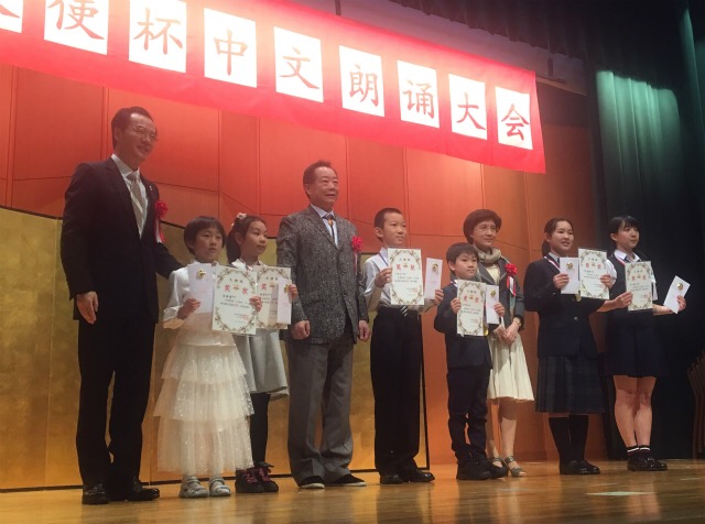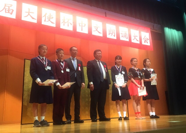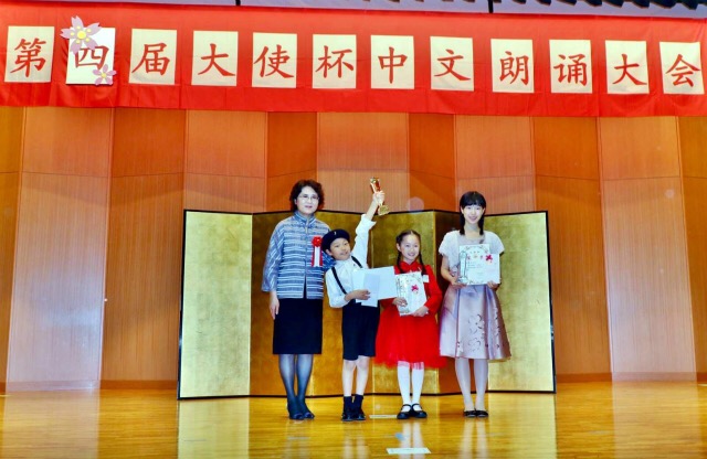 中国驻日大使夫人汪婉在颁奖前深情致辞,充分肯定了主办方对于中文推广的努力和远见卓识。她表示,中国国力增强让我们海外华人扬眉吐气,但是也让邻国产生不安,要消除这些不安,只用外交官的演讲和中国政府的官方努力是远远不够的。四年来,在“大使杯”上亲眼看孩子们的朗诵,最大的深切感受就是小朋友在诗词和自己的习作中,朗诵出的都是”和平、和谐”的思想,正如习主席所说:和平思想在中国人的DNA里,孩子们的一言一行就是最好的证明,他们将会成为中日发展的桥梁和纽带。最后汪婉女士预祝“大使杯”朗诵大会越办越好,越办越成功!