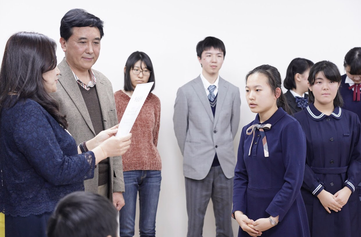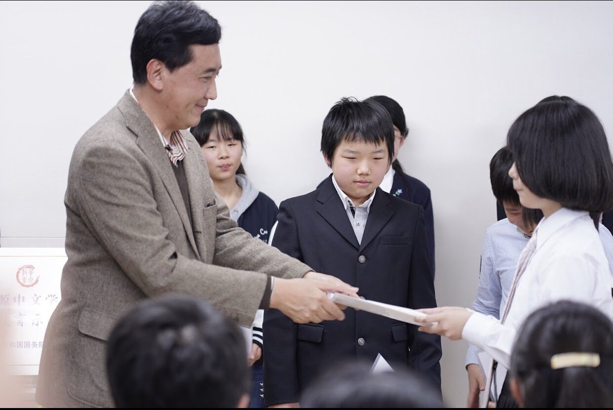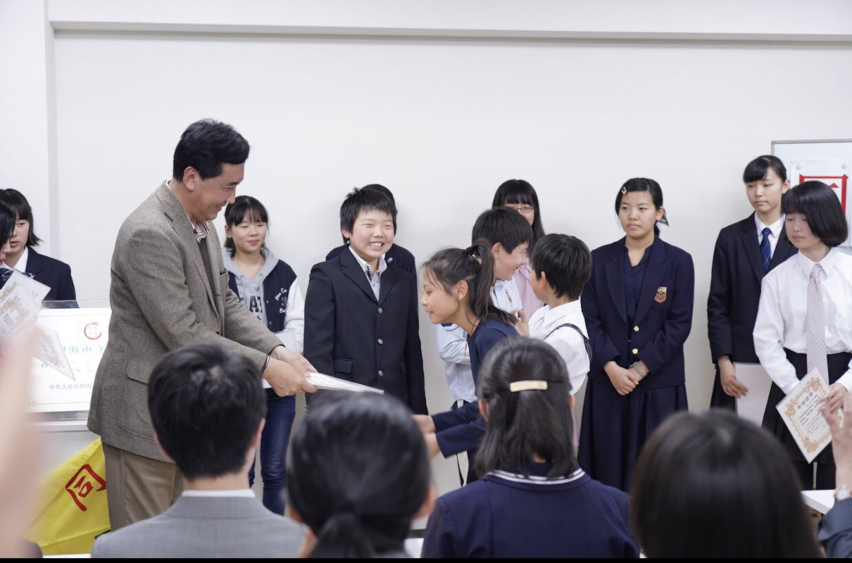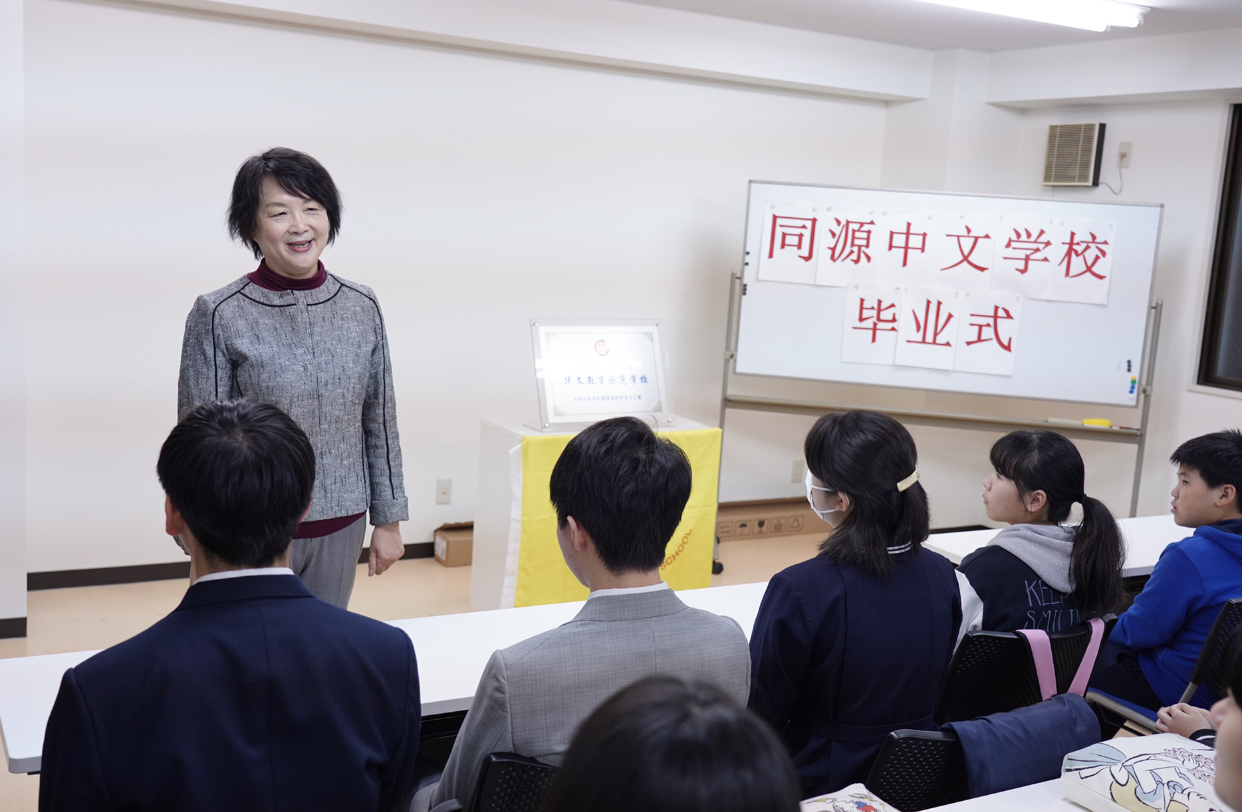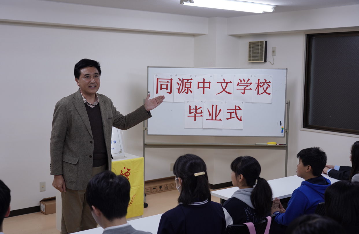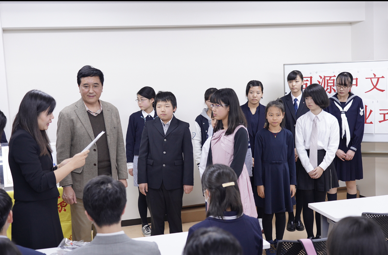 我们还荣幸地请到了东京话剧艺术协会凌庆成会长。他对毕业生们表示了诚挚的祝贺。还殷切地告诉毕业生们学好中文,可以和14亿中国人交朋友。凌会长还为与会的家长、毕业生们朗诵了王之涣的《登鹳雀楼》,以此来鼓励学生们学好中文,更上一层楼。他字正腔圆、抑扬顿挫的朗诵声赢得了热烈的掌声。