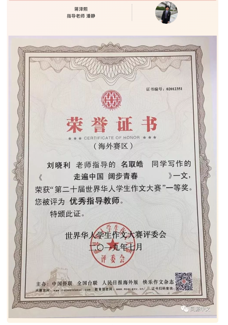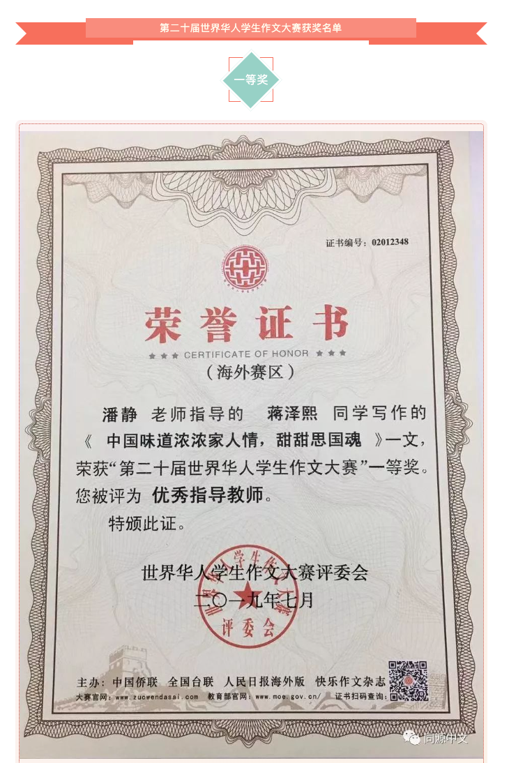 第二十届世界华人学生作文大赛获奖名单