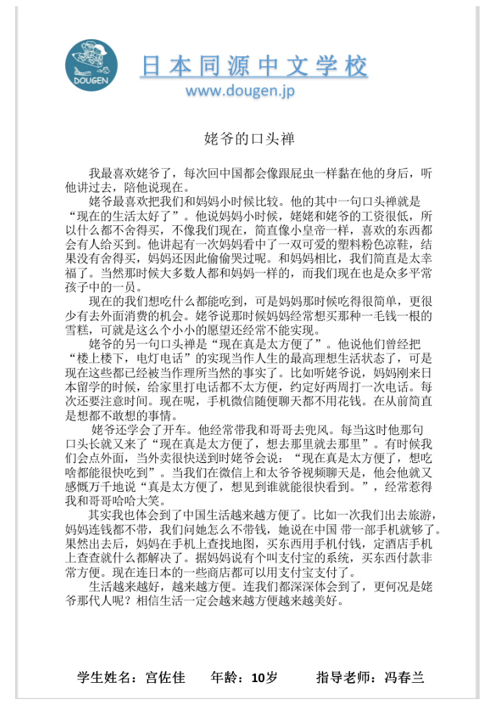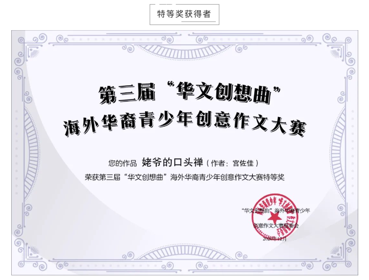 由江苏省人民政府侨务办公室、省教育厅、省文化和旅游厅联合主办的“华文创想曲”海外华裔青少年创意作文大赛,在历时半年的线上征集,紧张的初赛、复赛后,圆满落幕。日本同源中文学校的学生在老师的精心指导下,克服了因为疫情造成的各种影响,取得了本次大赛的特等奖、一等奖各一名、二等奖、习作奖若干名。