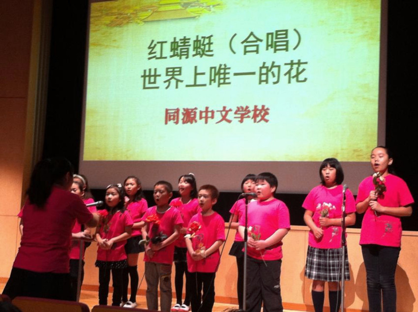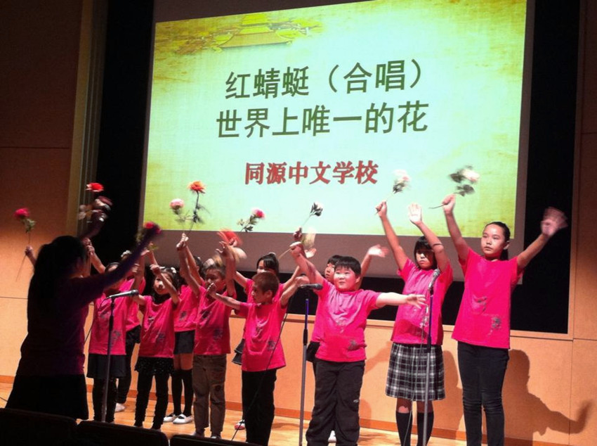 12月8日由东日本汉语教师协会主办的第三回“说汉语、通中国”中国语演讲会上,同源中文学校合唱团的的小学生给大哥哥、姐姐用中文演唱了日本歌曲:《红蜻蜓》《世界上唯一的花》,声援参加演讲比赛的选手们。合唱团小演员的年龄在6-12之间,合唱指挥陈静佳是东邦大学音乐专业的在校学生。尽管是第一次参加正式演出,小团员都很紧张,但是仍然圆满地完成了合唱。