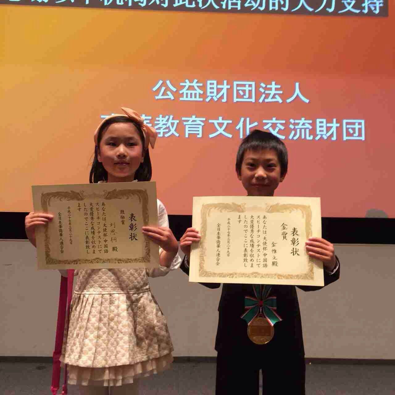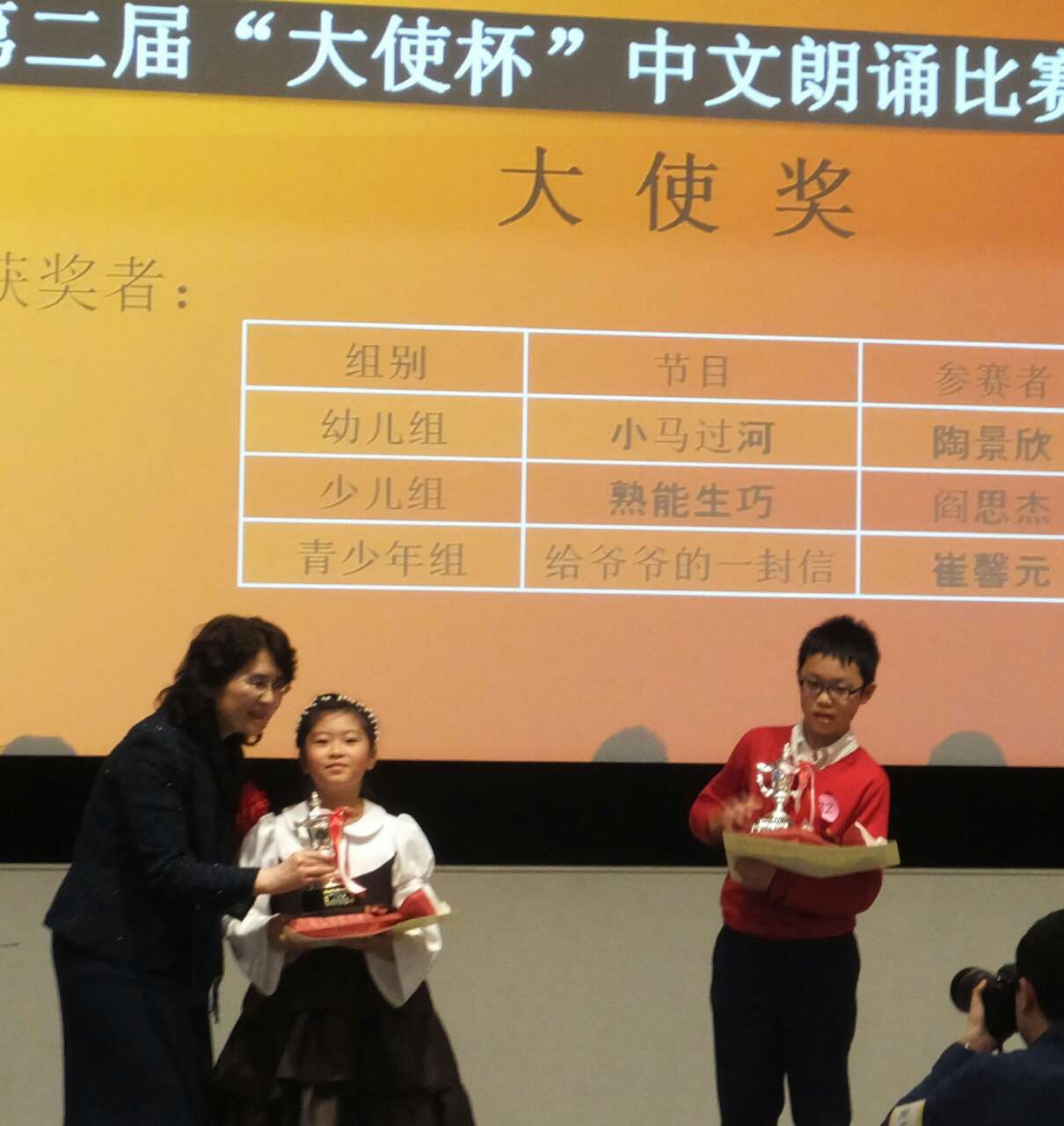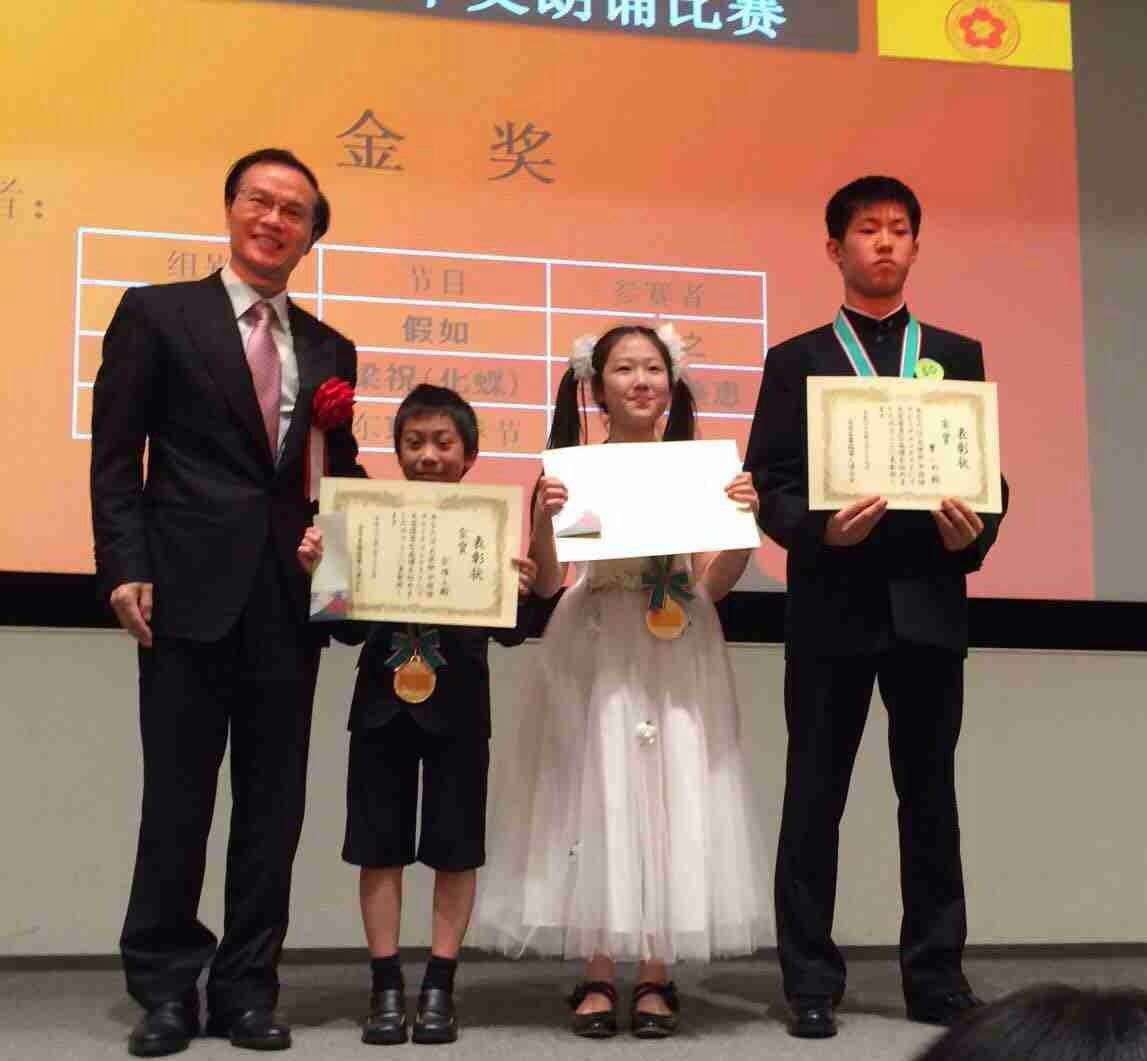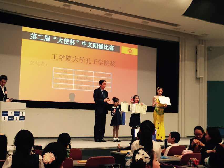 2015年3月28日星期日,由全日本华侨华人联合会主办、中华人民共和国驻日本国大使馆后援的全日本华侨华人联合会第二届大使杯中文朗诵比赛在工学院大学孔子学院隆重举办。此比赛的目的是为了让在日华侨华人子女传承和推广中华优秀文化,鼓励更多的华人子女爱中文、学中文、说中文。奖项有“大使奖”、“工学院孔子学院奖”等多项丰厚大奖。同源中文学校新小岩校陶景欣同学获幼儿组大使奖,大使夫人汪婉女士颁发奖杯奖状。刘羽桐同学获得幼儿组工学院大学孔子学院奖,参赛题目为《春雨的颜色》。池袋校竹内万喜子同学获得青少年组工学院大学孔子学院奖,演讲题目是自创作文《我和孔雀舞》,由工学院孔子学院院长颁奖。松户校金惟之同学获幼儿组金奖,他朗诵的内容是《假如》。松户校傅思敏同学、池袋包安同学分别获青少年组铜奖。刘思桐、宫本美佳、傅明羽、曾维瑶、曾维笑获幼儿组鼓励奖。陶景欣同学(左二)荣获幼儿组大使奖,由大使夫人汪婉女士颁发奖杯奖状刘羽桐同学(左二)和竹内万喜子同学(右一)分别获得幼儿组和青少年组工学院大学孔子学院奖金惟之同学获得幼儿组金奖金惟之同学(左二)荣获幼儿组金奖刘羽桐同学手拿奖杯奖状竹内万喜子和大使夫人汪婉女士合影竹内万喜子和全日本华侨华人联合会会长颜安先生合影刘思桐和金惟之