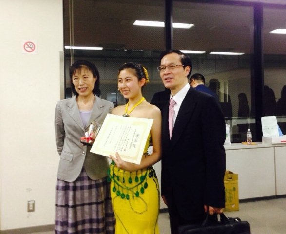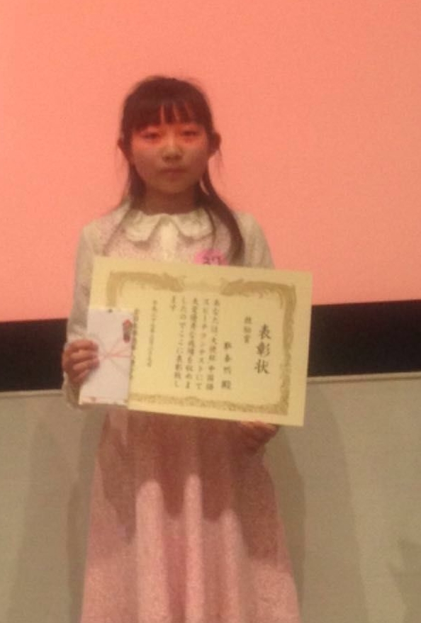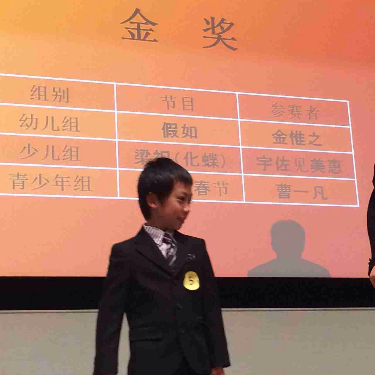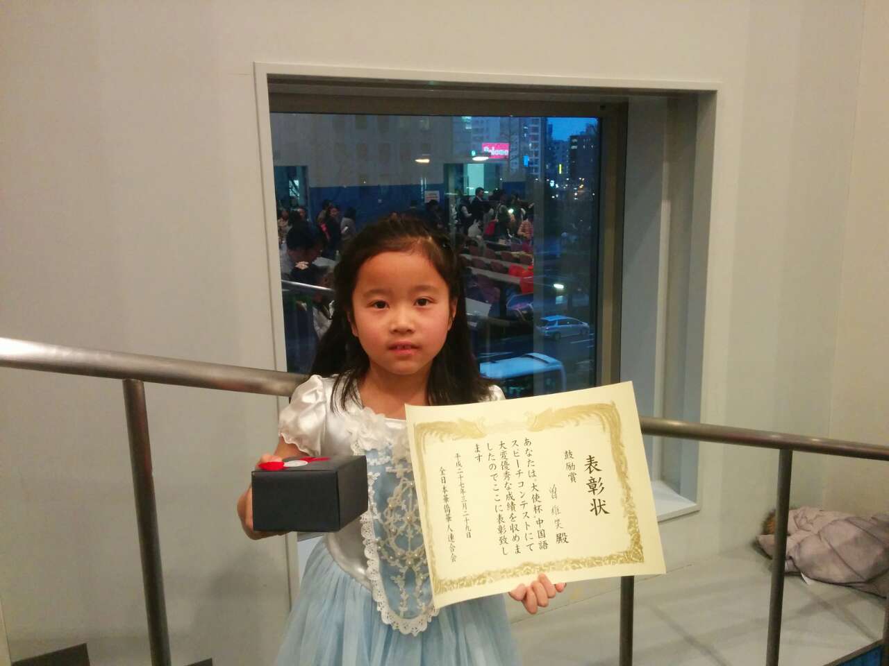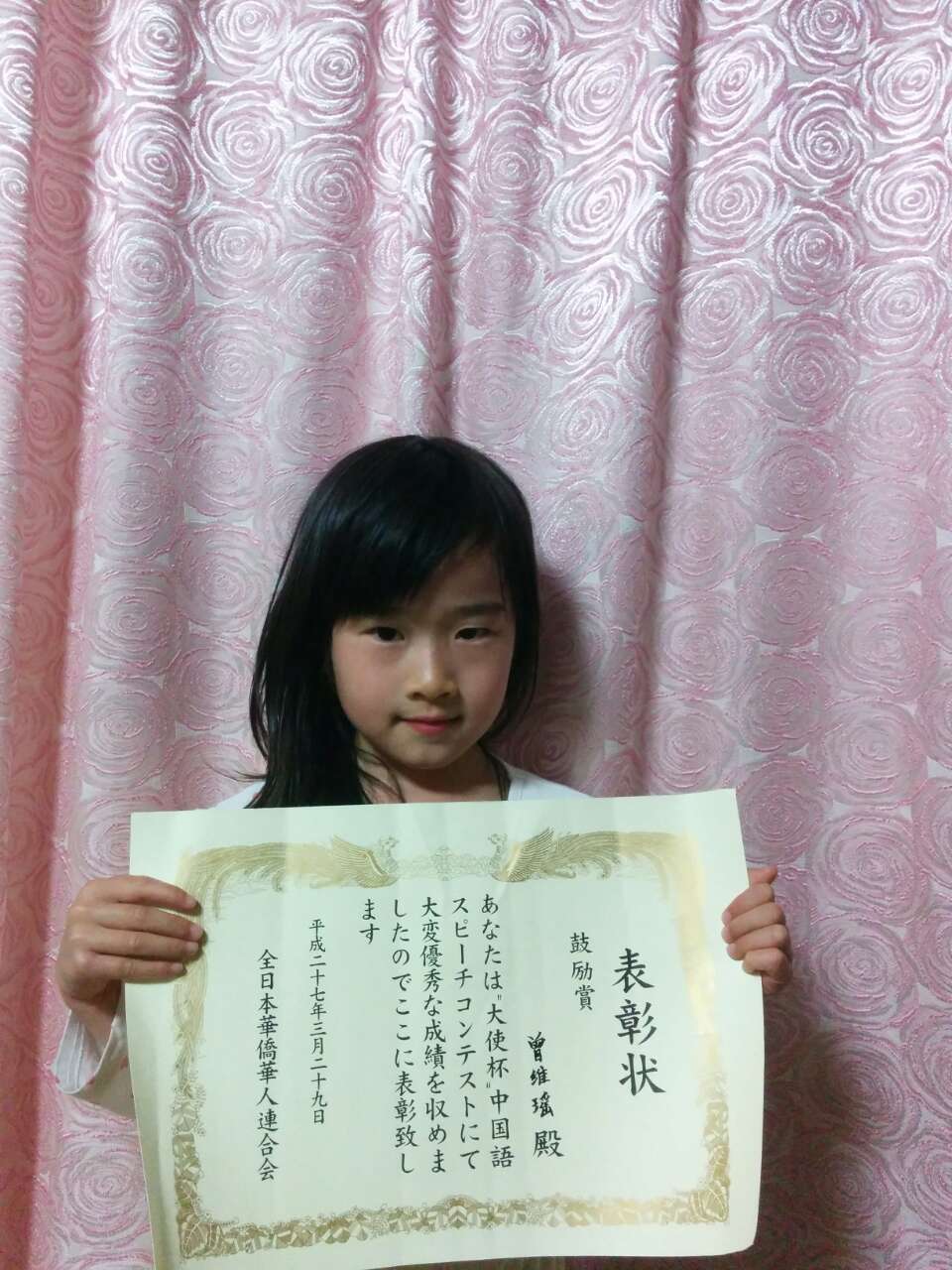 2015年3月28日星期日,由全日本华侨华人联合会主办、中华人民共和国驻日本国大使馆后援的全日本华侨华人联合会第二届大使杯中文朗诵比赛在工学院大学孔子学院隆重举办。此比赛的目的是为了让在日华侨华人子女传承和推广中华优秀文化,鼓励更多的华人子女爱中文、学中文、说中文。奖项有“大使奖”、“工学院孔子学院奖”等多项丰厚大奖。同源中文学校新小岩校陶景欣同学获幼儿组大使奖,大使夫人汪婉女士颁发奖杯奖状。刘羽桐同学获得幼儿组工学院大学孔子学院奖,参赛题目为《春雨的颜色》。池袋校竹内万喜子同学获得青少年组工学院大学孔子学院奖,演讲题目是自创作文《我和孔雀舞》,由工学院孔子学院院长颁奖。松户校金惟之同学获幼儿组金奖,他朗诵的内容是《假如》。松户校傅思敏同学、池袋包安同学分别获青少年组铜奖。刘思桐、宫本美佳、傅明羽、曾维瑶、曾维笑获幼儿组鼓励奖。陶景欣同学(左二)荣获幼儿组大使奖,由大使夫人汪婉女士颁发奖杯奖状刘羽桐同学(左二)和竹内万喜子同学(右一)分别获得幼儿组和青少年组工学院大学孔子学院奖金惟之同学获得幼儿组金奖金惟之同学(左二)荣获幼儿组金奖刘羽桐同学手拿奖杯奖状竹内万喜子和大使夫人汪婉女士合影竹内万喜子和全日本华侨华人联合会会长颜安先生合影刘思桐和金惟之