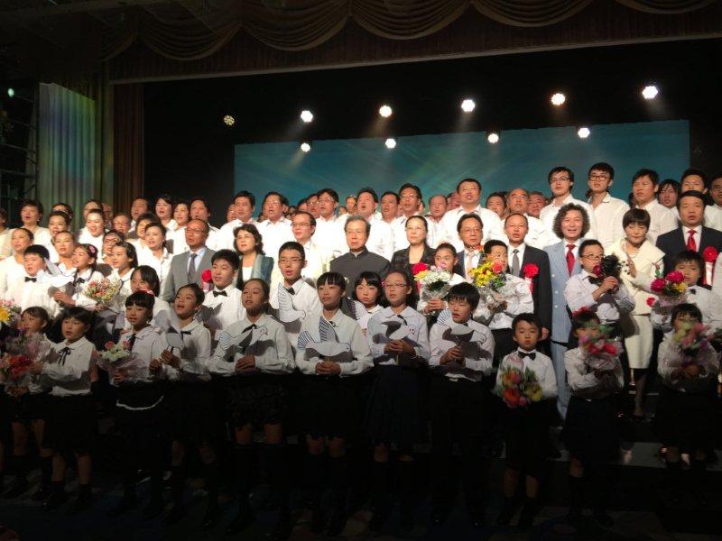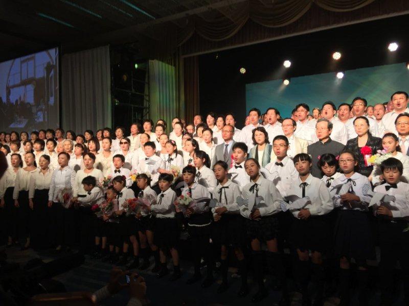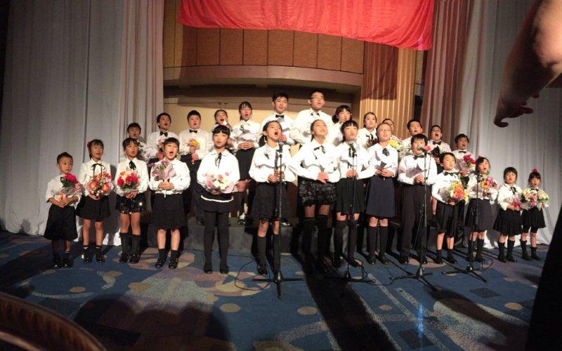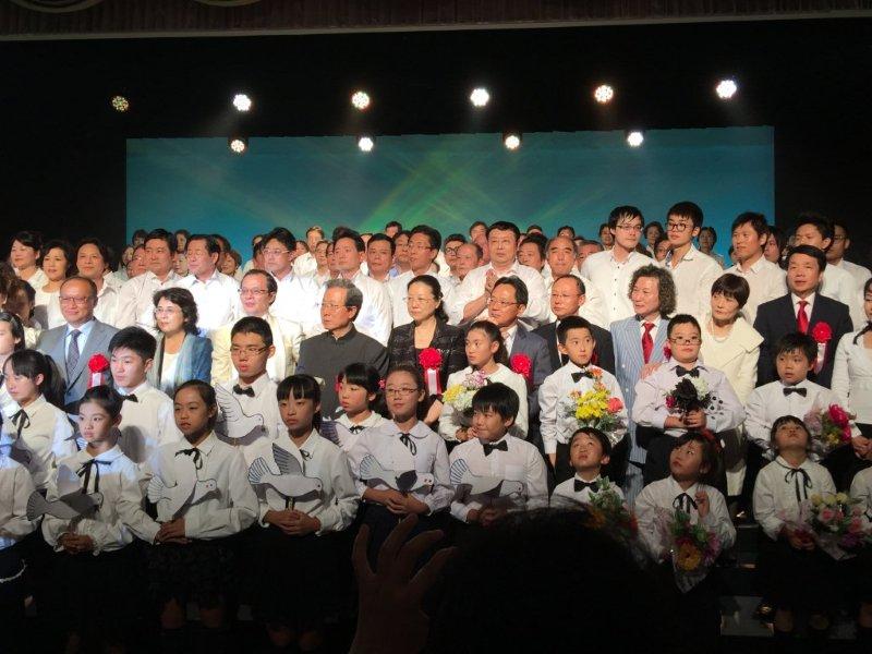 同源学校合唱团27名小朋友和在日华人一道参加了建国66周年和世界反法西斯战争70周年纪念活动。当手持和平鸽和花束的孩子们用清脆甜美的歌声唱响和平时,整个会场充满了欢快的气氛。9月8日颜安会长紧急布置了这项工作,很多家长取消了事先予定好的五连休安排。这首歌是小朋友第一次听到,朱老师先把歌曲发到所有家长手机里,有的家长找歌词,有的家长注拼音,第一次练习许多小朋友已经会唱了。两周内进行了四次合练,小朋友就登台了,甜美的歌声迎得了大家的掌声。感谢协作,尽力的各位、以及无名英雄:吴老师设计了服装服饰;图画龚老师设计了和平鸽;家长们把自己孩子穿小的衣裙鞋祙都拿来了;五次活动是家长全程陪伴;一位妈妈练习途中接到家人病危通知,在机场还给大家鼓劲;演出当天同源合唱团有两名专业化妆师给小朋友化妆;没有家长接送的孩子,由顺路的家长一起带来。活动中朱老师严格要求和指导,王团长及老师们一丝不苟地照顾学生们的安全。合唱结束后小朋友下台告诉妈妈,"有的大人哭了,最后我也掉泪了。"身在日本,孩子们对祖国的了解实在太少,这次演岀对他们是难得的体验和教育,让他们感受中国正在日益富强。几百名华人同台共唱就是为了让他们的未来充满和平,充满阳光。