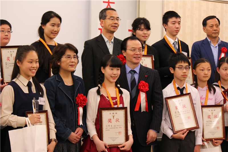 大使夫人汪婉女士、日本全华联会长颜安先生等与获奖选手合影