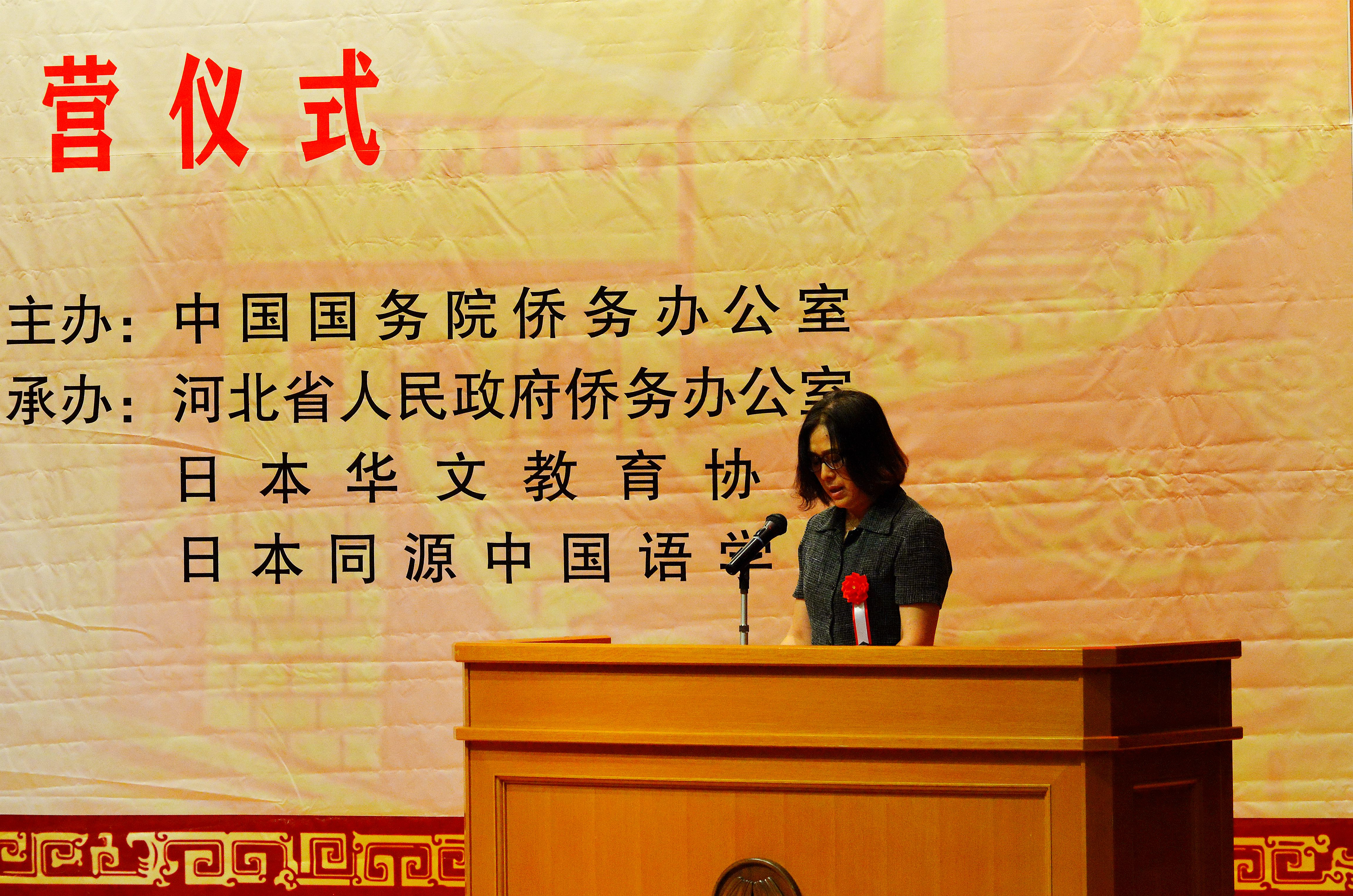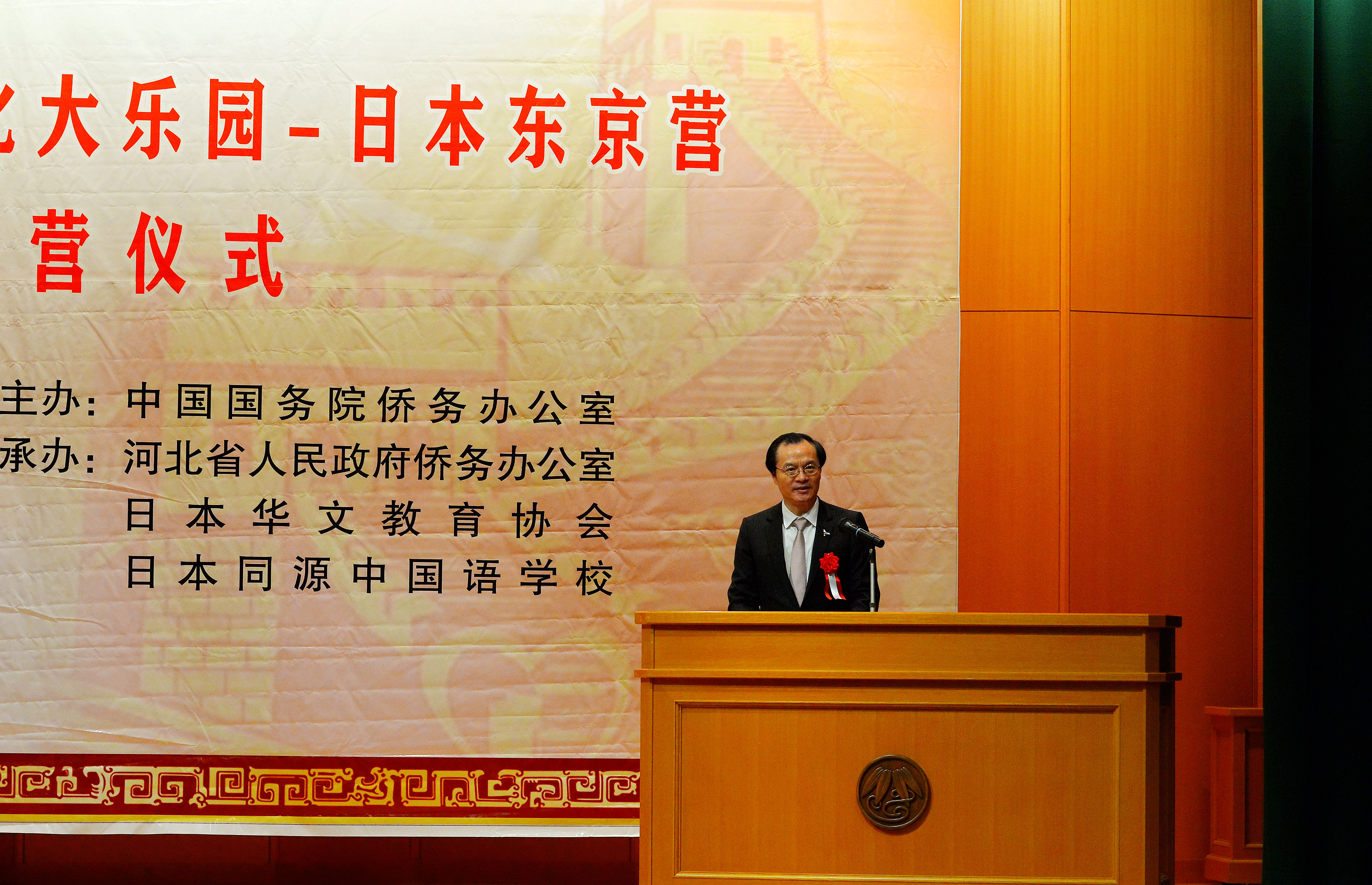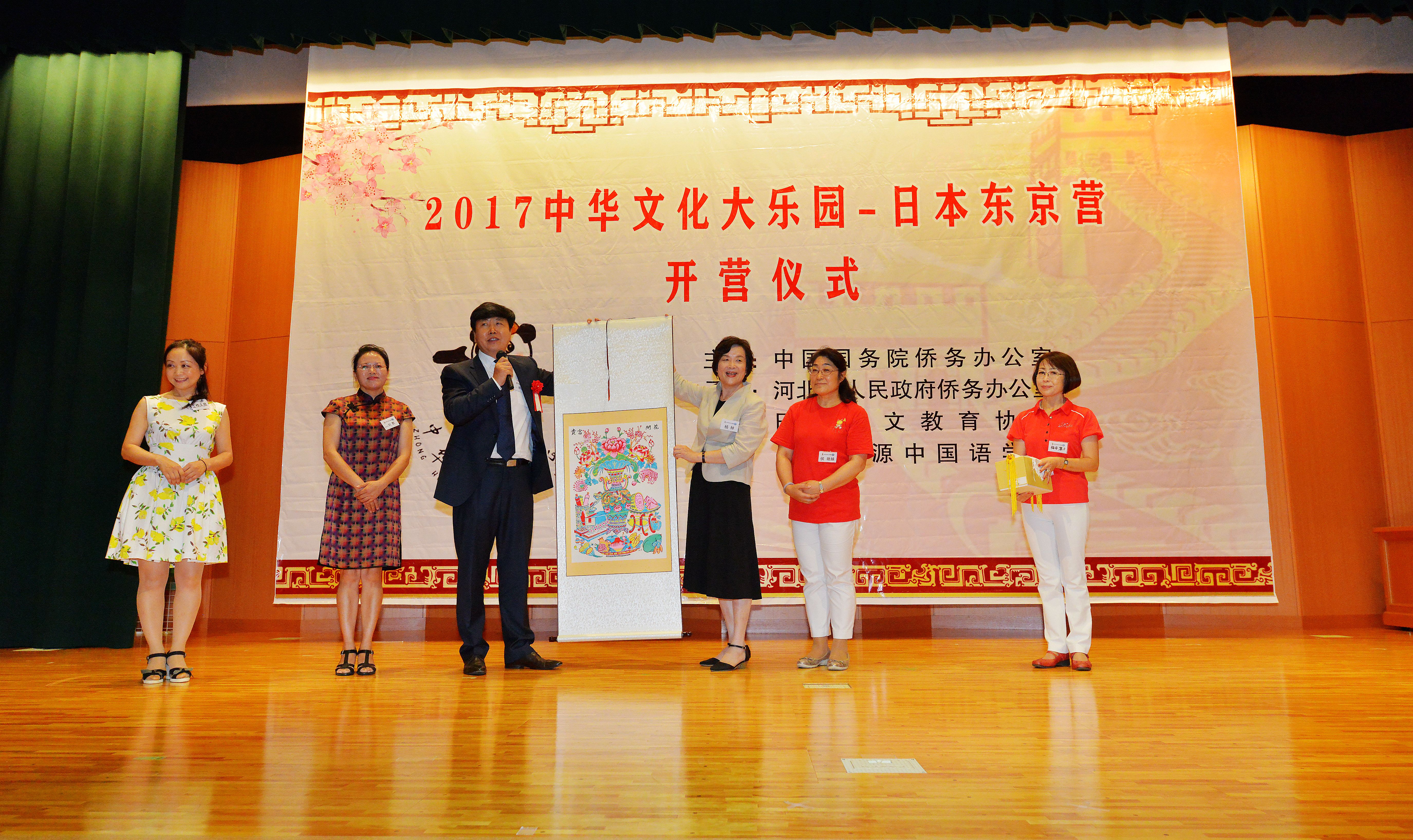 河北省外侨办副调研员徐炳旭在致辞中,介绍了本次中华文化大乐园东京营的学习安排,他说:“为了实实在在办好东京大乐园活动,河北省外侨办从河北省8所学校和武强年画博物馆选拔出12位才艺专家教师,带来中国武术、中国画、歌曲、舞蹈、手工、书法、年画制作、汉语、戏曲和腰鼓等丰富多彩的中华才艺到东京开展教学活动。东京夏令营将紧扣“中华文化”主题,以‘五个一’为基本目标,即学会一首歌、一支舞、一套拳、一幅画、一件手工艺品,寓教于乐,传授中华文化基本元素。”