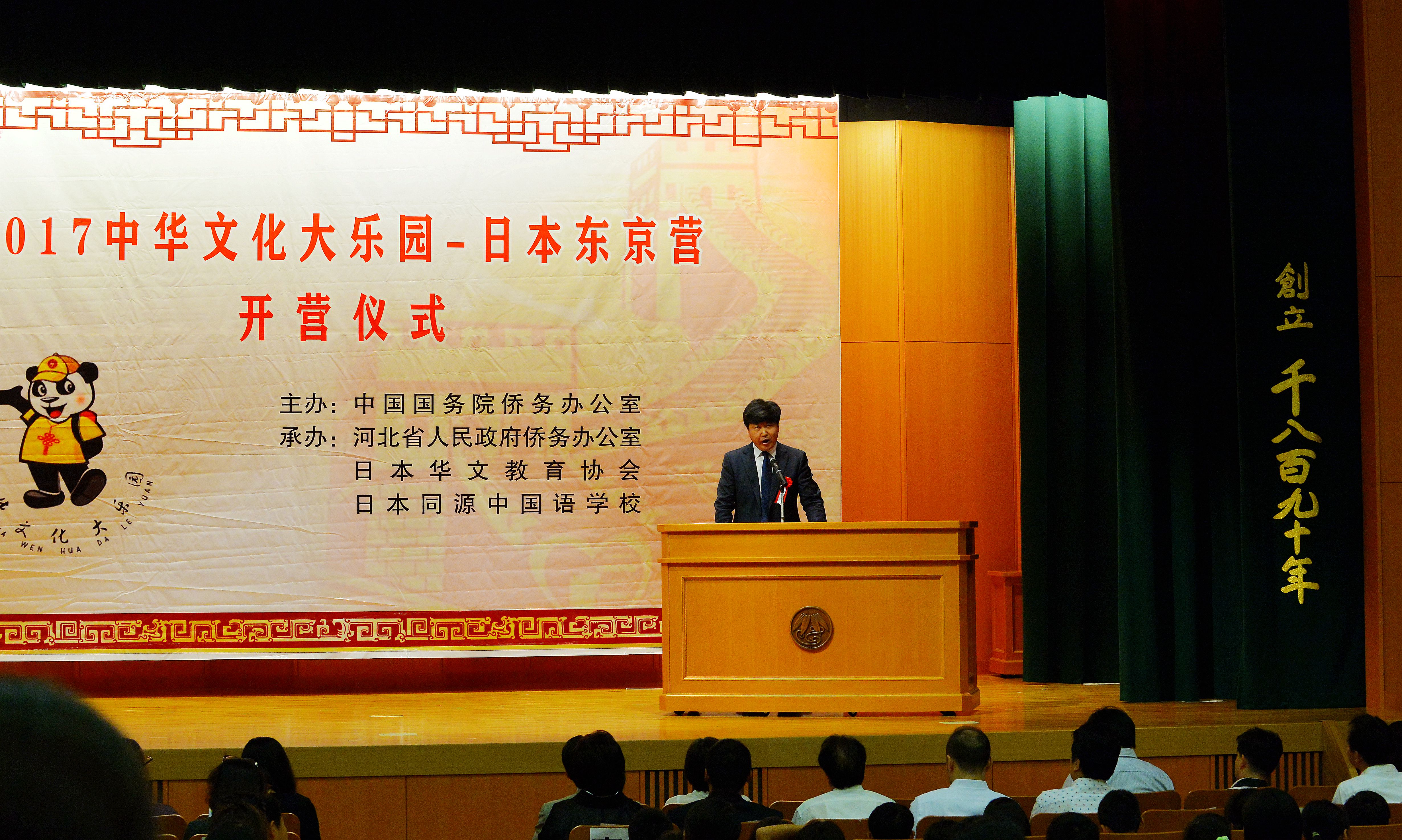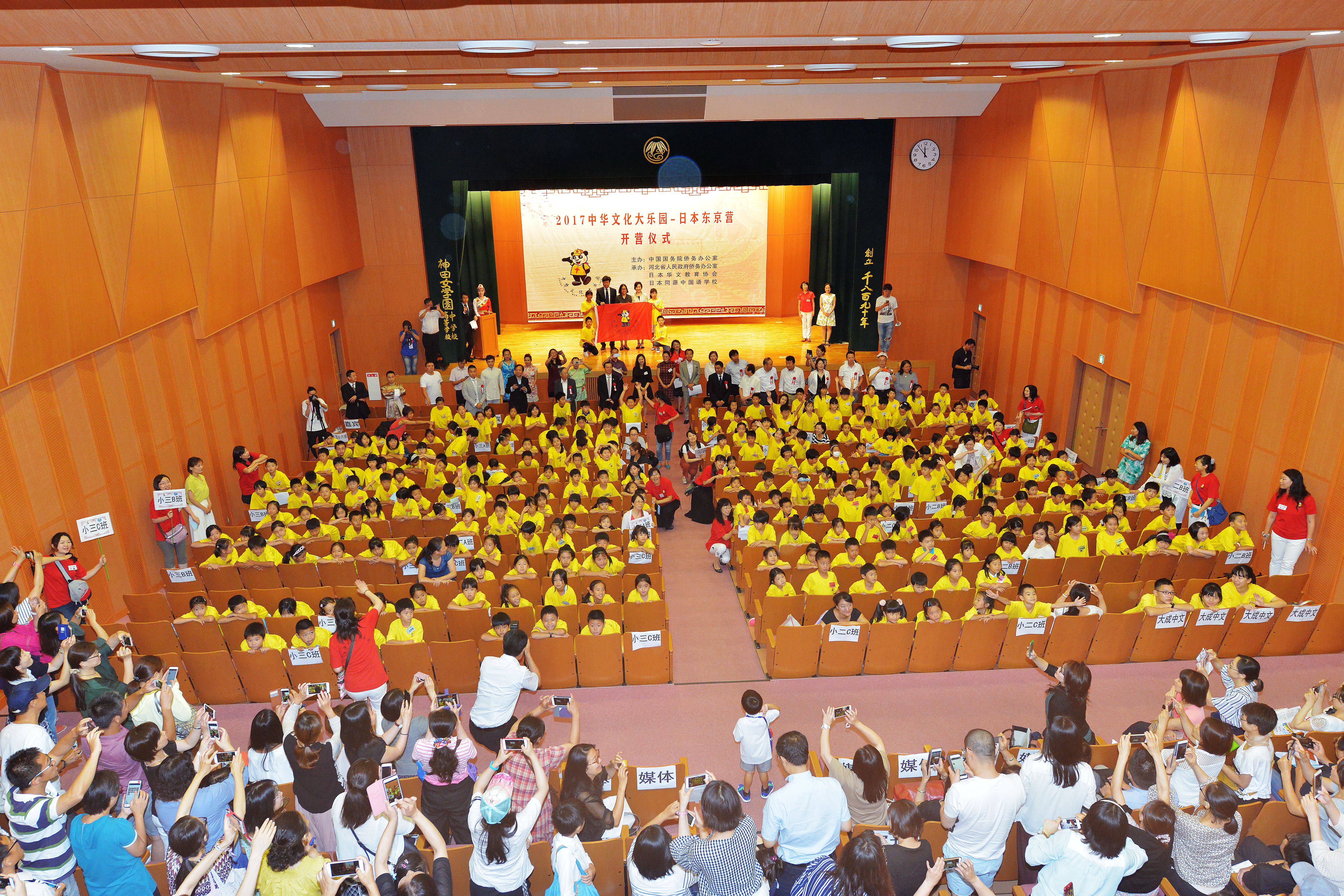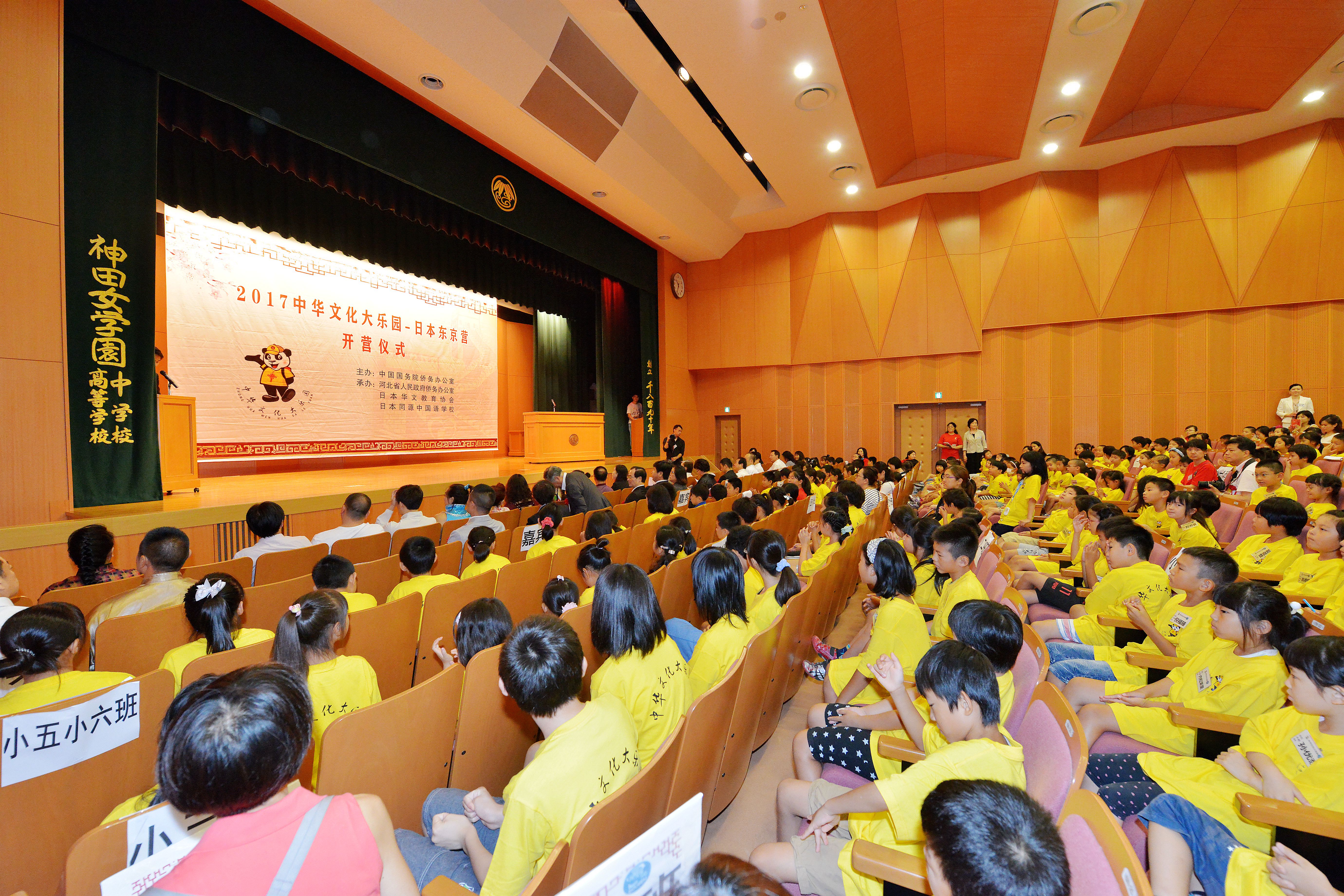 弘扬中国文化,传承龙的精神!面向在日华人子女的暑期夏令营——2017年“中华文化大乐园”日本东京营的开营仪式,7月24日上午在位于东京千代田区的东京神田女学园大礼堂隆重举行,中国驻日本大使馆参赞高振杰、中国河北省外侨办副调研员徐炳旭、日本华文教育协会会长颜安等嘉宾应邀与会并登台致辞,200多名参加东京营学习的华人孩子们及100多位家长,来自河北省外侨办选派的十多位老师,以及神田女学园校长高桥顺子女士,全日本华侨华人联合会会长刘洪友、横滨山手中华学校校长张岩松等有关方面负责人,也一同参加了这一喜庆热烈、充满活力的开营仪式。