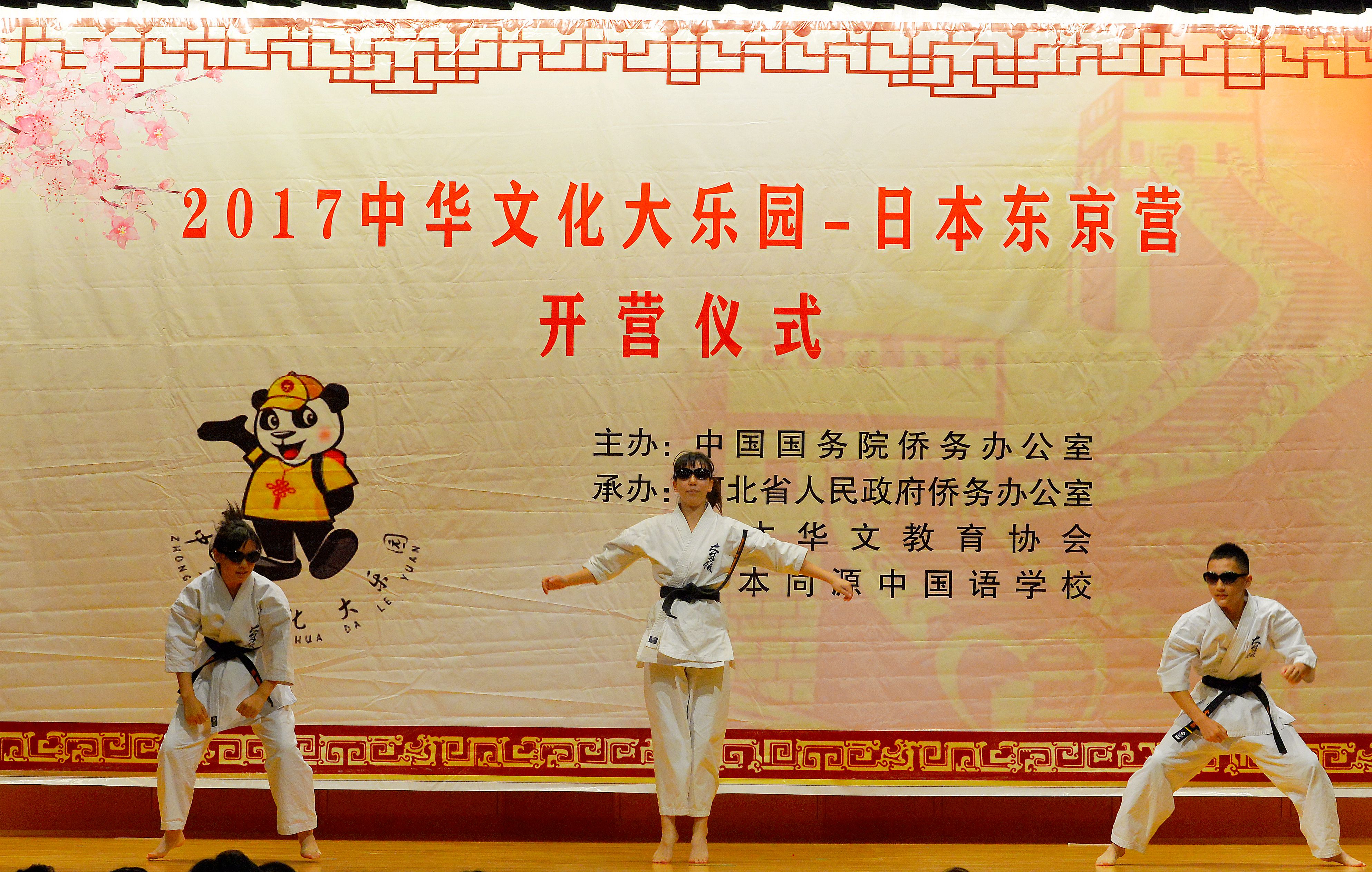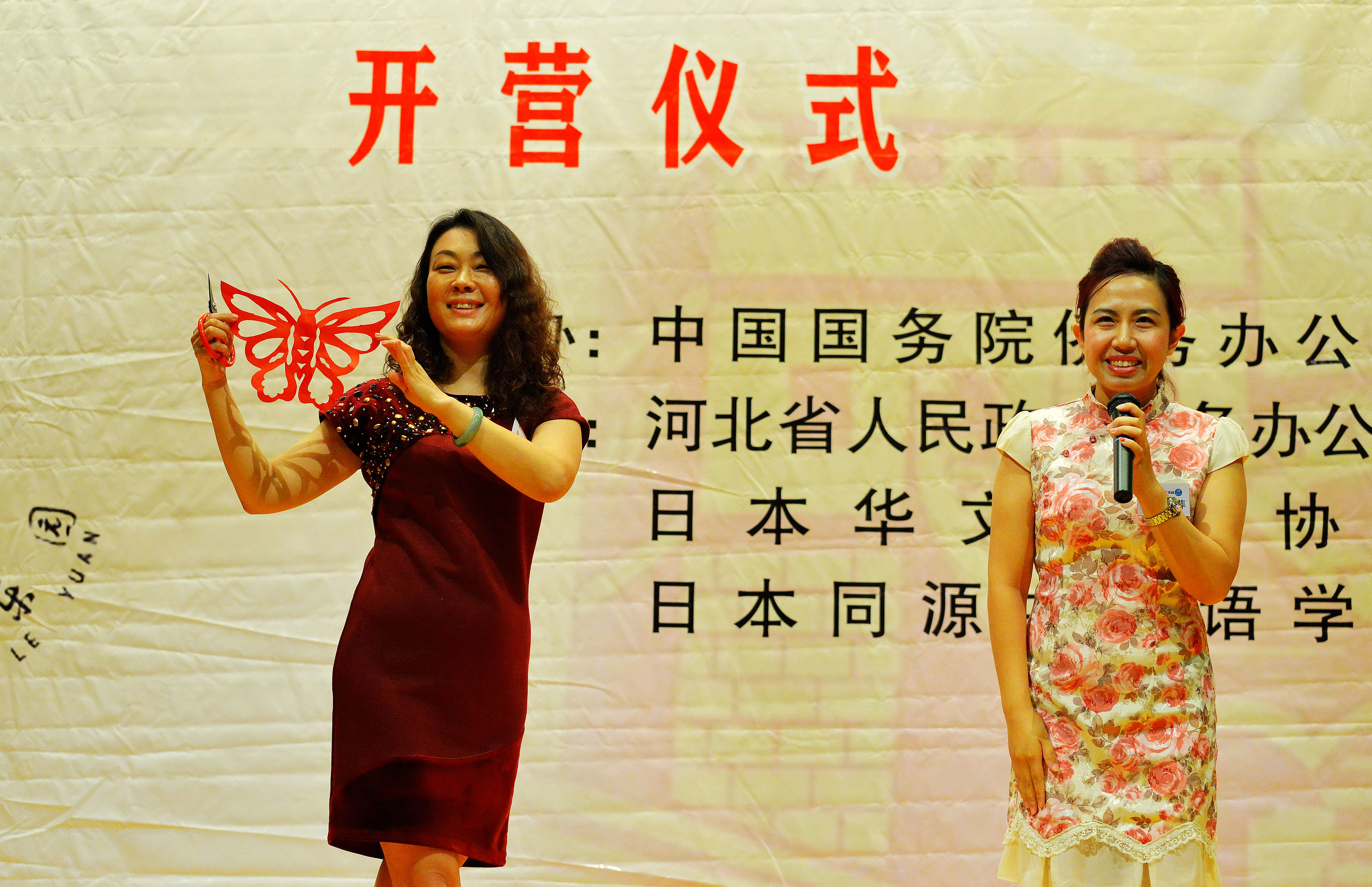 在开营仪式上,来自日本同源中文学校和大成中文学校的华人孩子们,分别表演了中日文合唱、小组唱、中国武术意拳演武,日本神田女学园的日本学生表演了“和大鼓”;在介绍了来自河北省的教师阵容之后,这些经过精心选拔的中国文化各领域的精英教师们,当场给在座的华人孩子及家长们,表演了中国戏曲清唱、民族舞蹈、歌曲独唱、武术、诗歌朗诵、剪纸等,引发孩子们一阵阵欢呼声和掌声。
