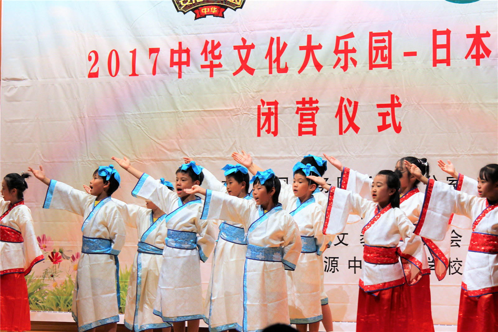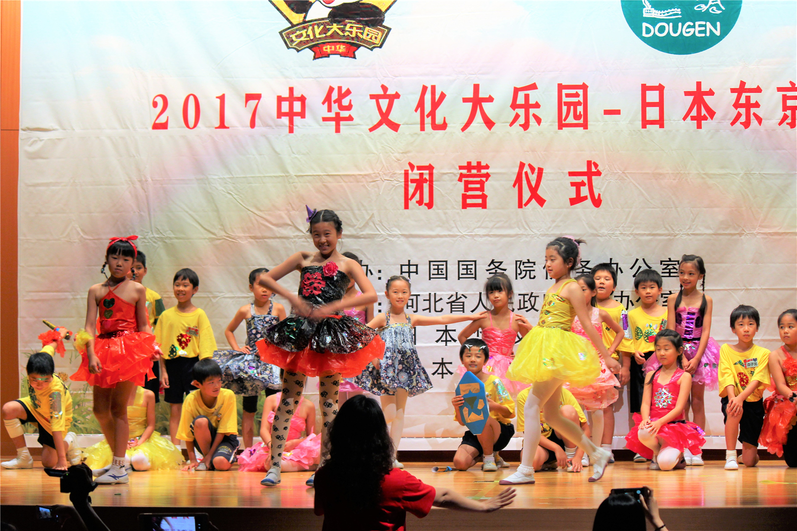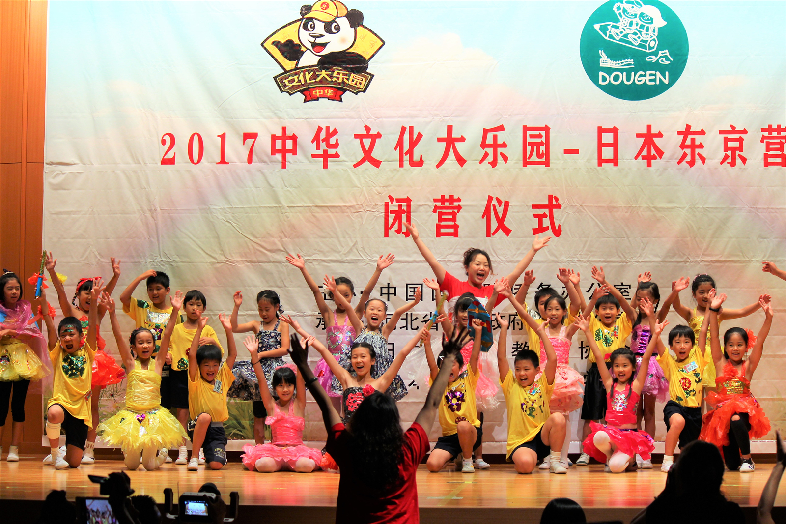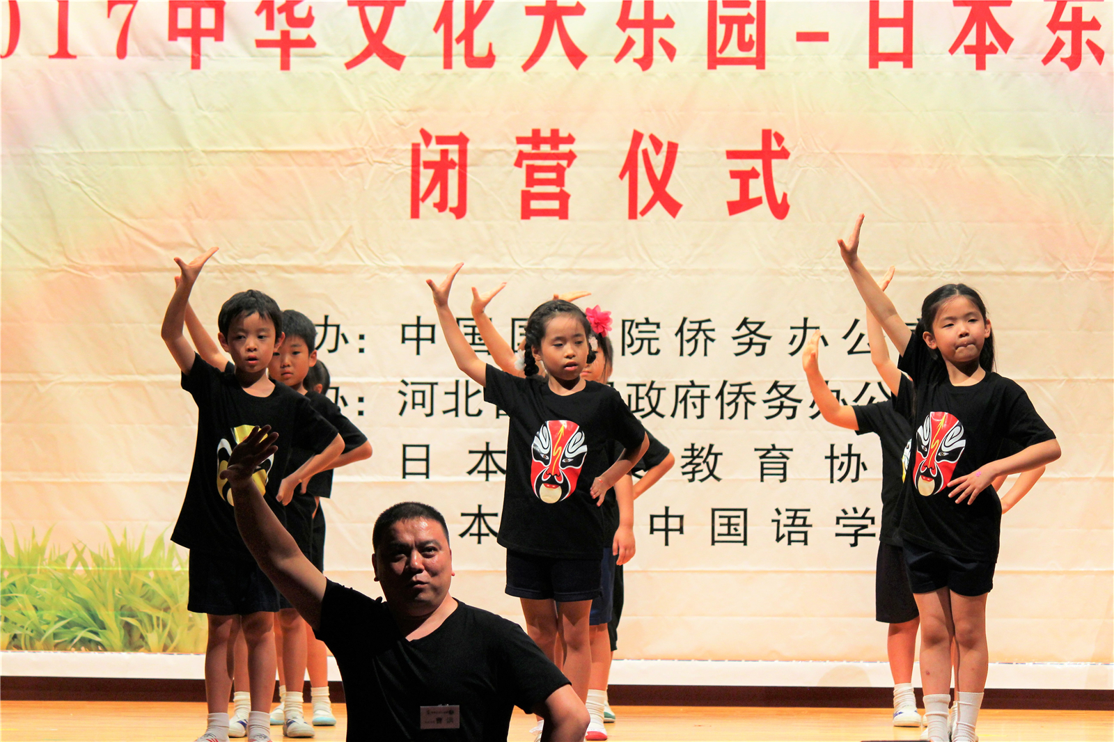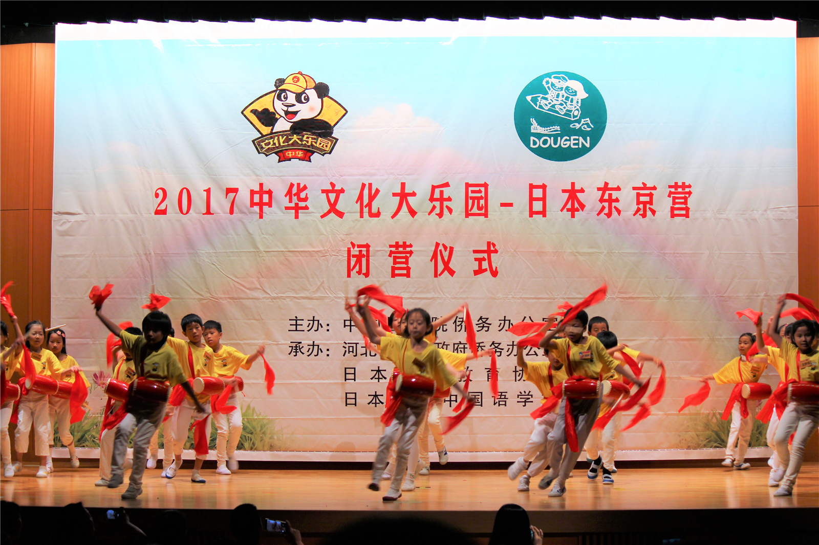 2017年7月31日下午,中国文化大乐园东京营闭营式在震耳欲聋的腰鼓声中拉开了帷幕。在闭营式上,10个班的小营员们先后表演了11个精彩的节目,展示了他们的8天的学习成果。悠远古韵的诗词、苍劲有力的书法、动作优美的舞蹈、浓淡相宜的国画、节奏欢快的腰鼓、姿势连贯的长拳、铿锵有力的京剧、寓意吉祥的年画、造型别致的剪纸、传统健身的五禽戏、激昂顿挫的歌曲。赢得了河北老师、嘉宾以及家长们的阵阵掌声。