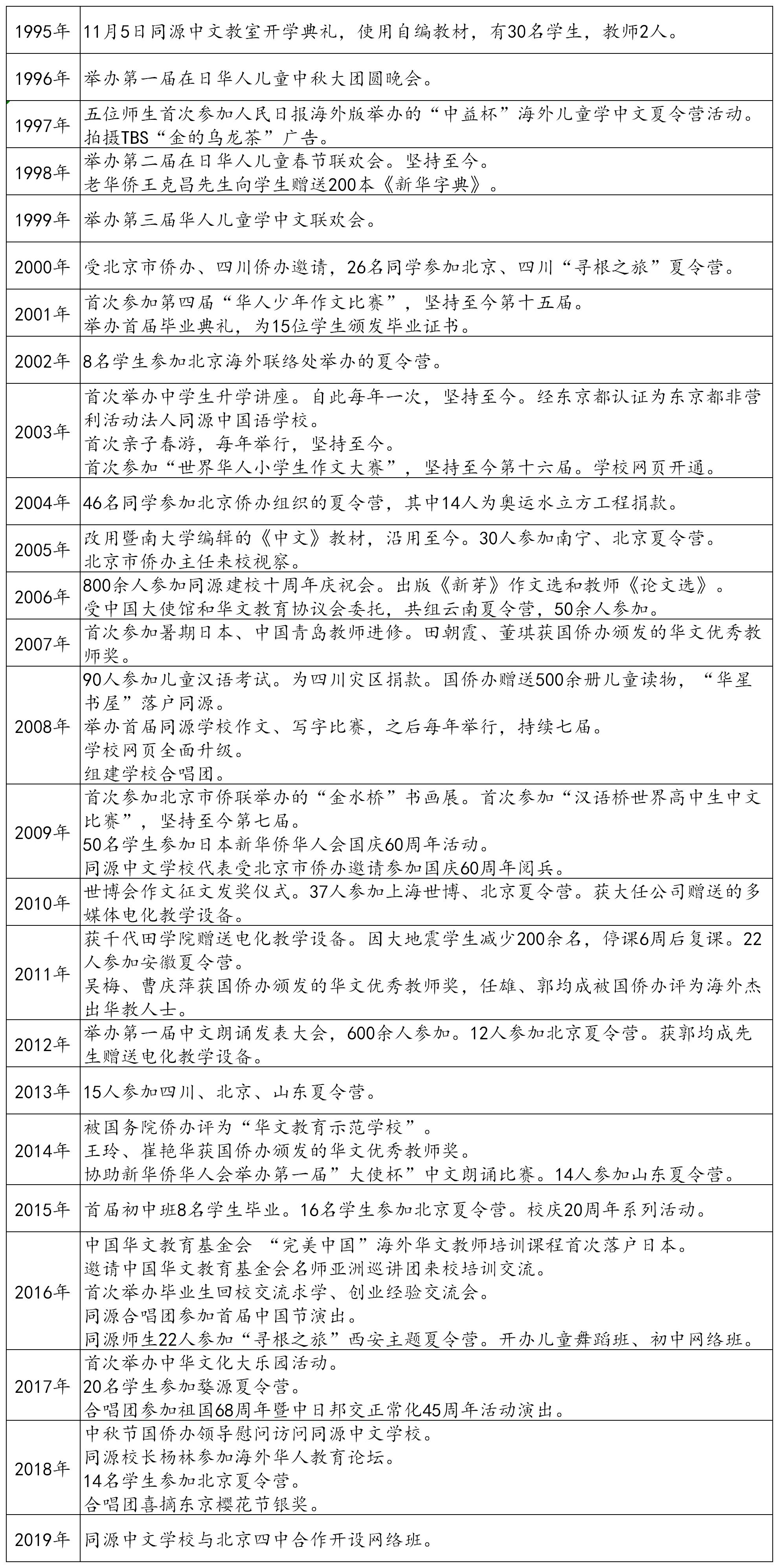 同源中文学校从开始时的几十名学生,发展到现在1400多名学生,50多名老师的日本最大的、历史最长的周末学校。在原本荒芜的华文教育的土地上,为近万名华裔儿童学习中文,体验、感受中华文化提供了机会,培养了千名毕业生。2003年被东京都认定为NPO法人,2013年被中国国务院侨办授予华文教育示范学校称号。