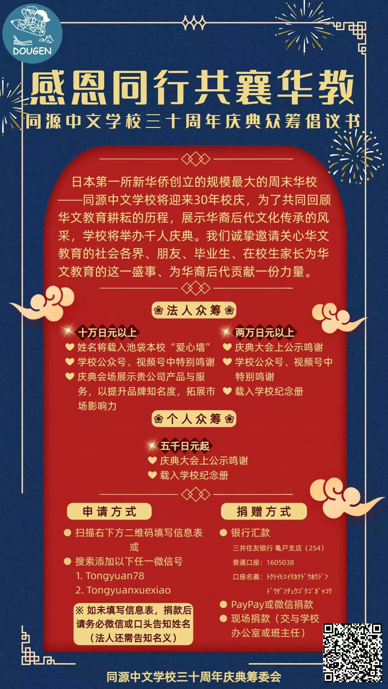 三十载春华秋实,三十载桃李芬芳。2025年,日本第一所周末华校——同源中文学校将迎来建校30周年的重要里程碑。在此,我们谨向长期以来关心、支持学校发展的社会各界人士和家长朋友们,致以最诚挚的感谢和最崇高的敬意!